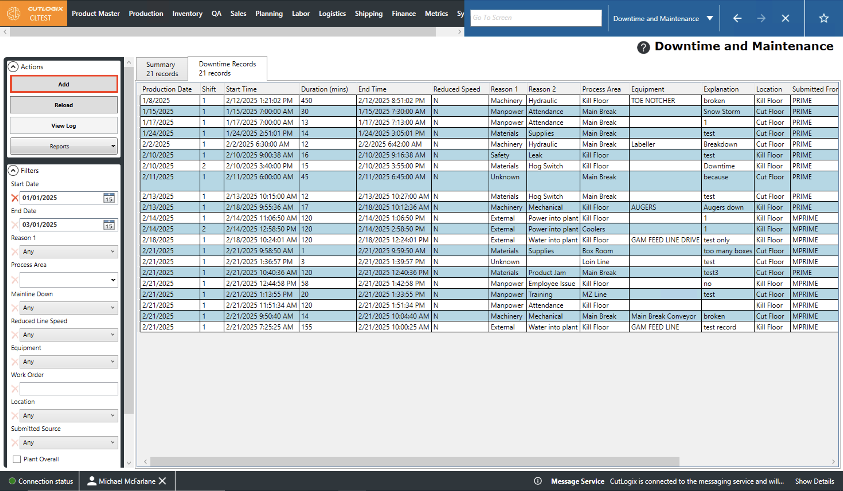 DemoNote: Downtime records can also be created from the "Daily Kill Floor Report" and "Daily Cut Floor Report" pages. Downtime records added on those pages will appear on their respective dates in the "Downtime Records" tab on the "Downtime and Maintenance" page. They are also factored into the data shown on the "Summary" tab on the "Downtime and Maintenance" page.