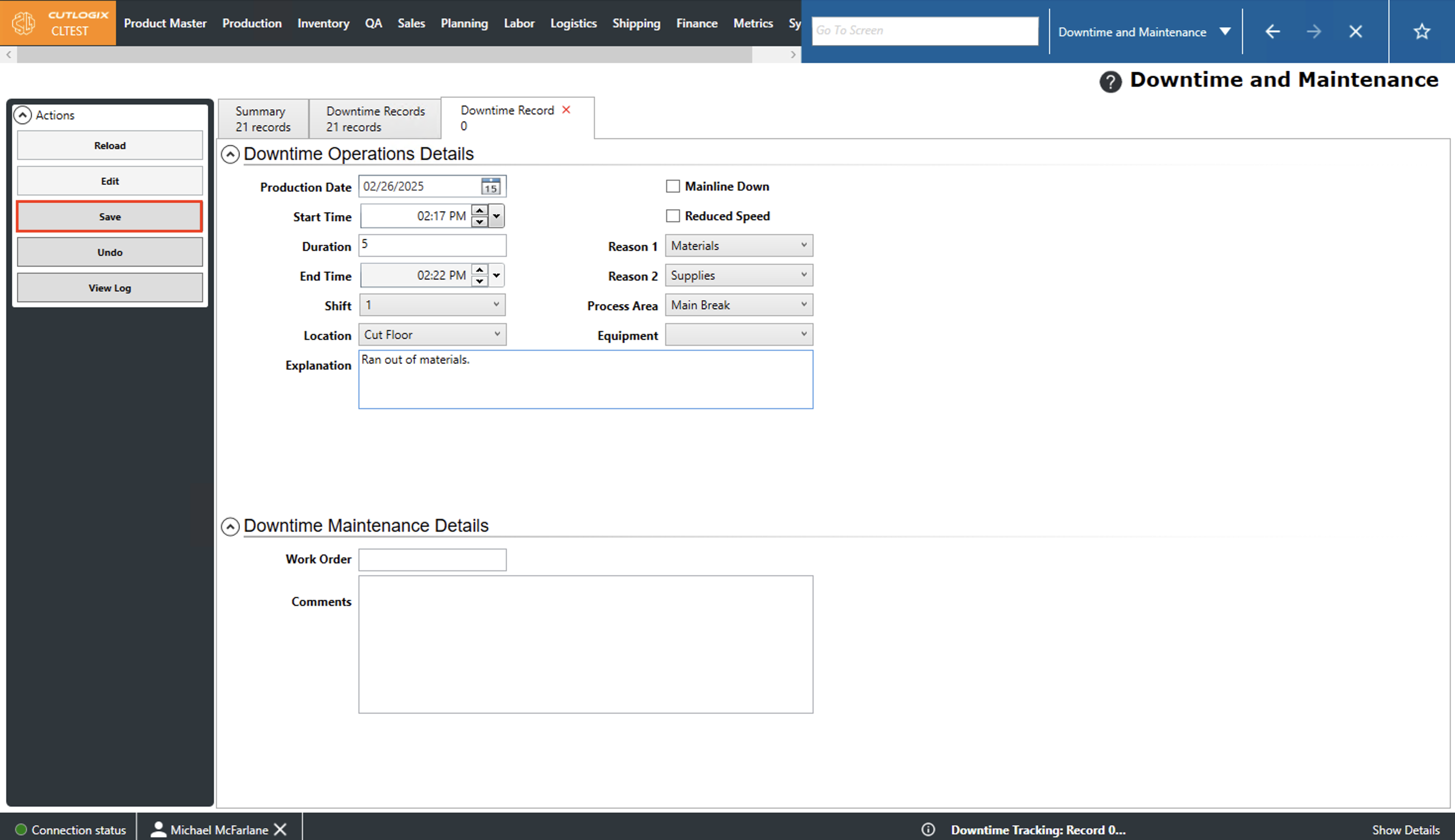 Step 6: The new downtime record will be saved and visible on the "Downtime Records" tab.