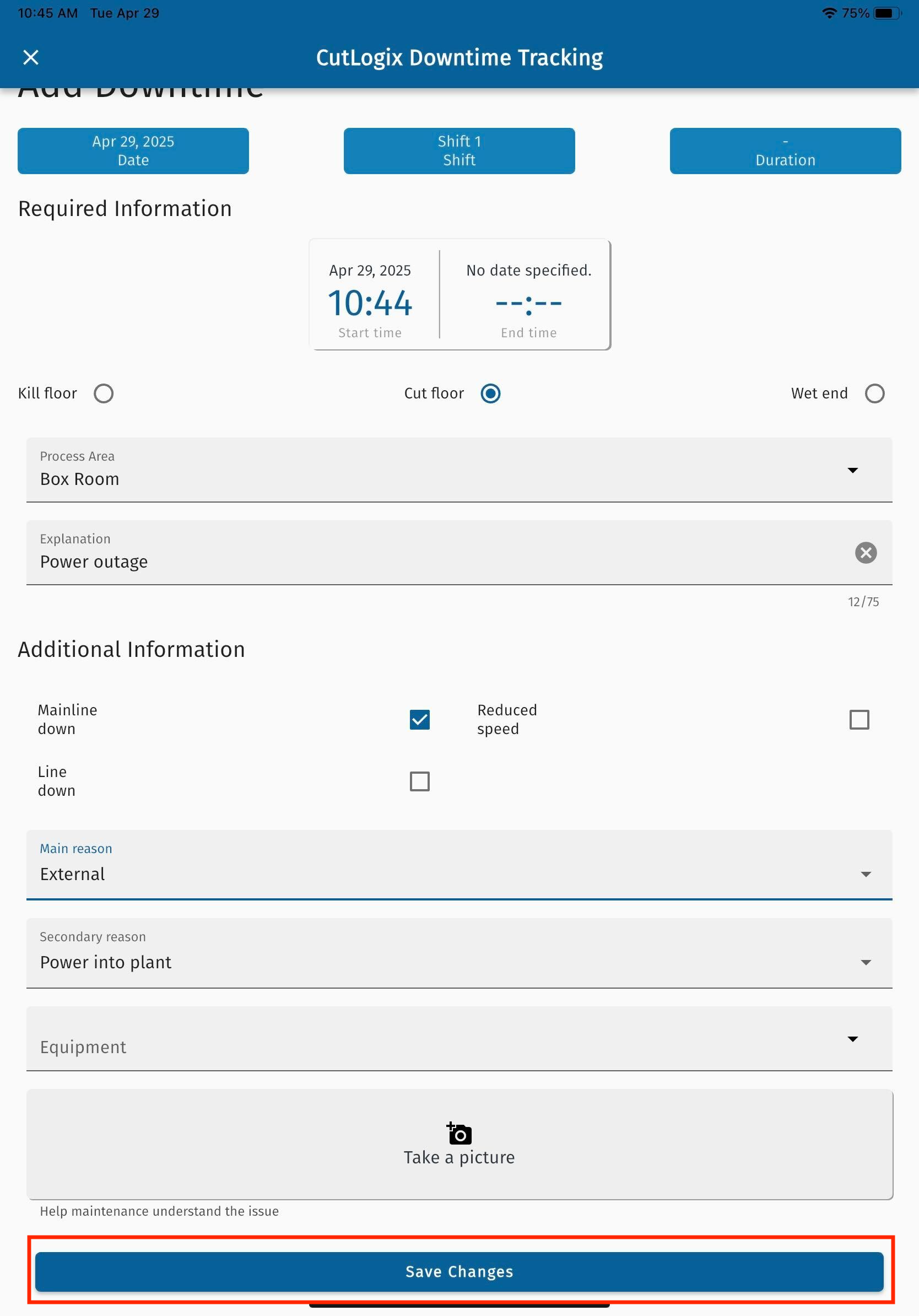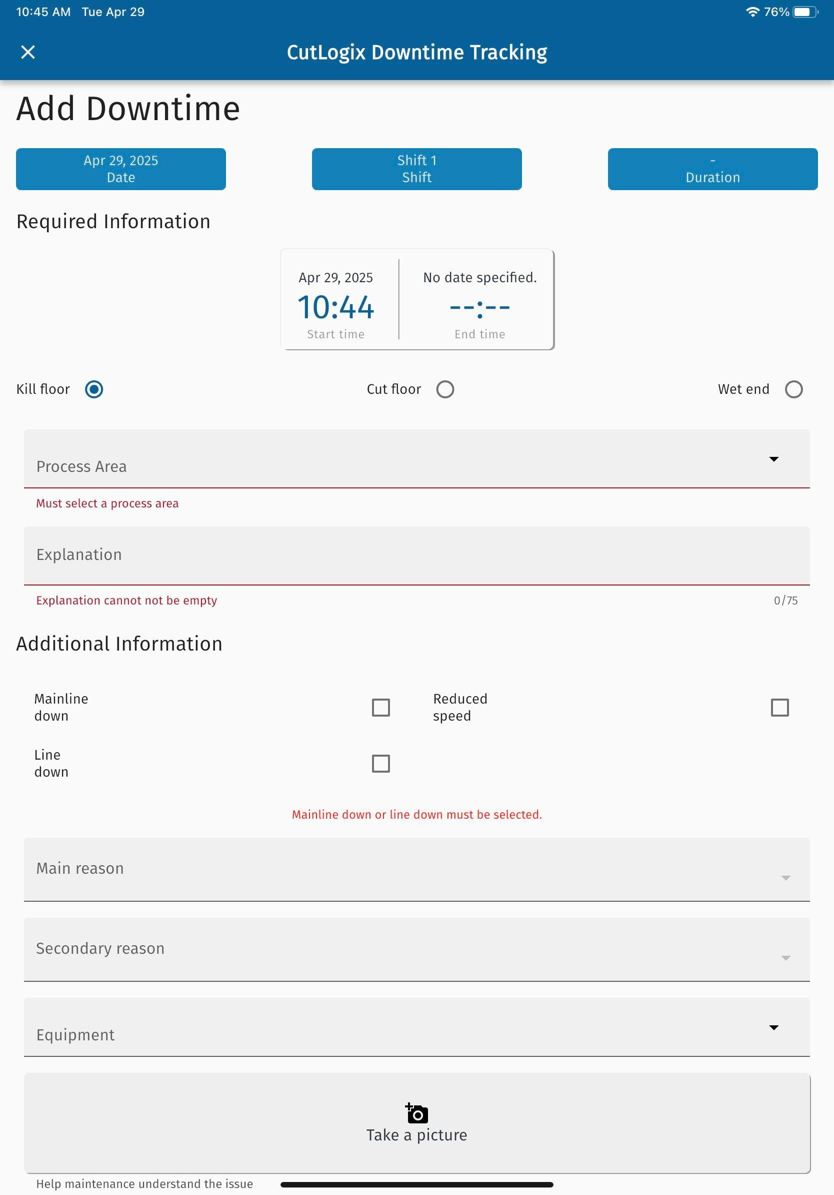 • Kill Floor/Cut Floor/Wet End: The location where the downtime has occurred.