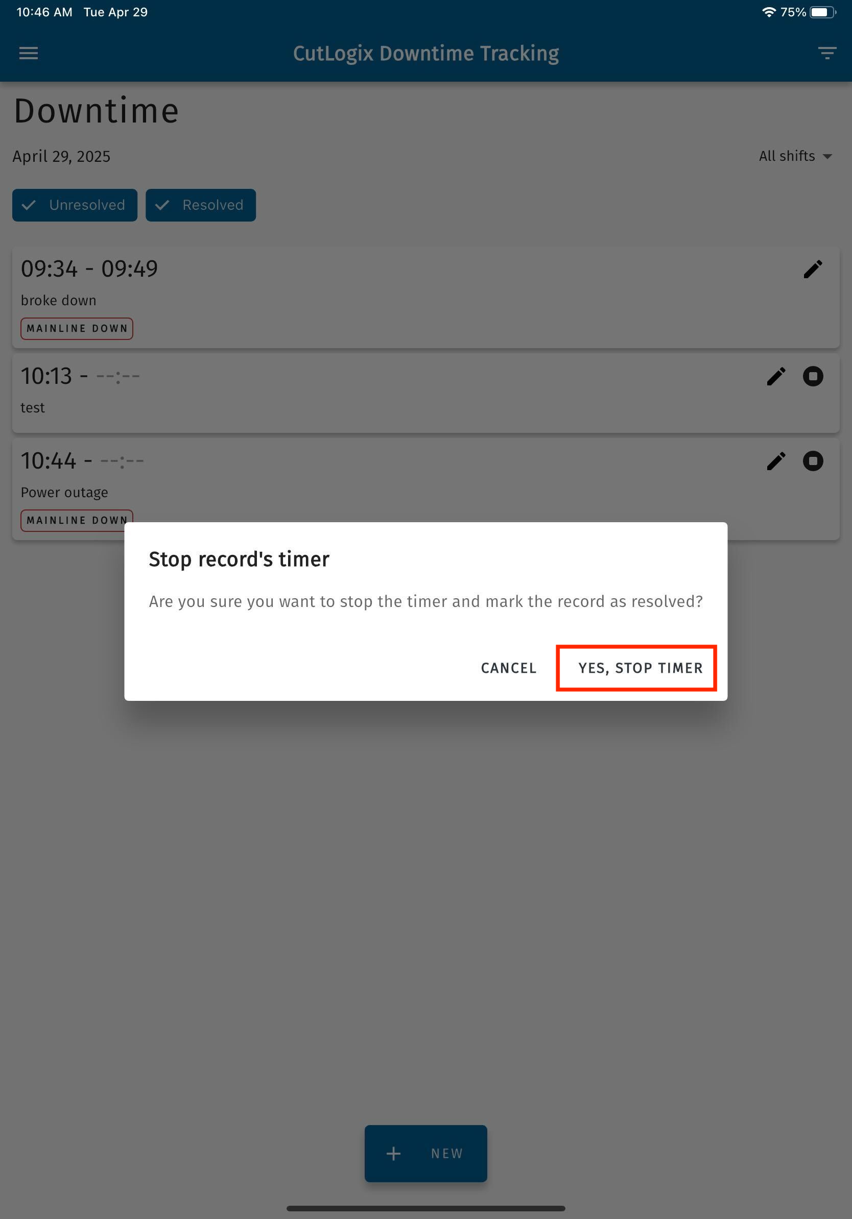 NOTE: When downtime records are created & saved in the CutLogix mobile app, a timer starts for them if no end time was specified on the downtime record. The next step outlines how to stop the timer once the downtime is over.
