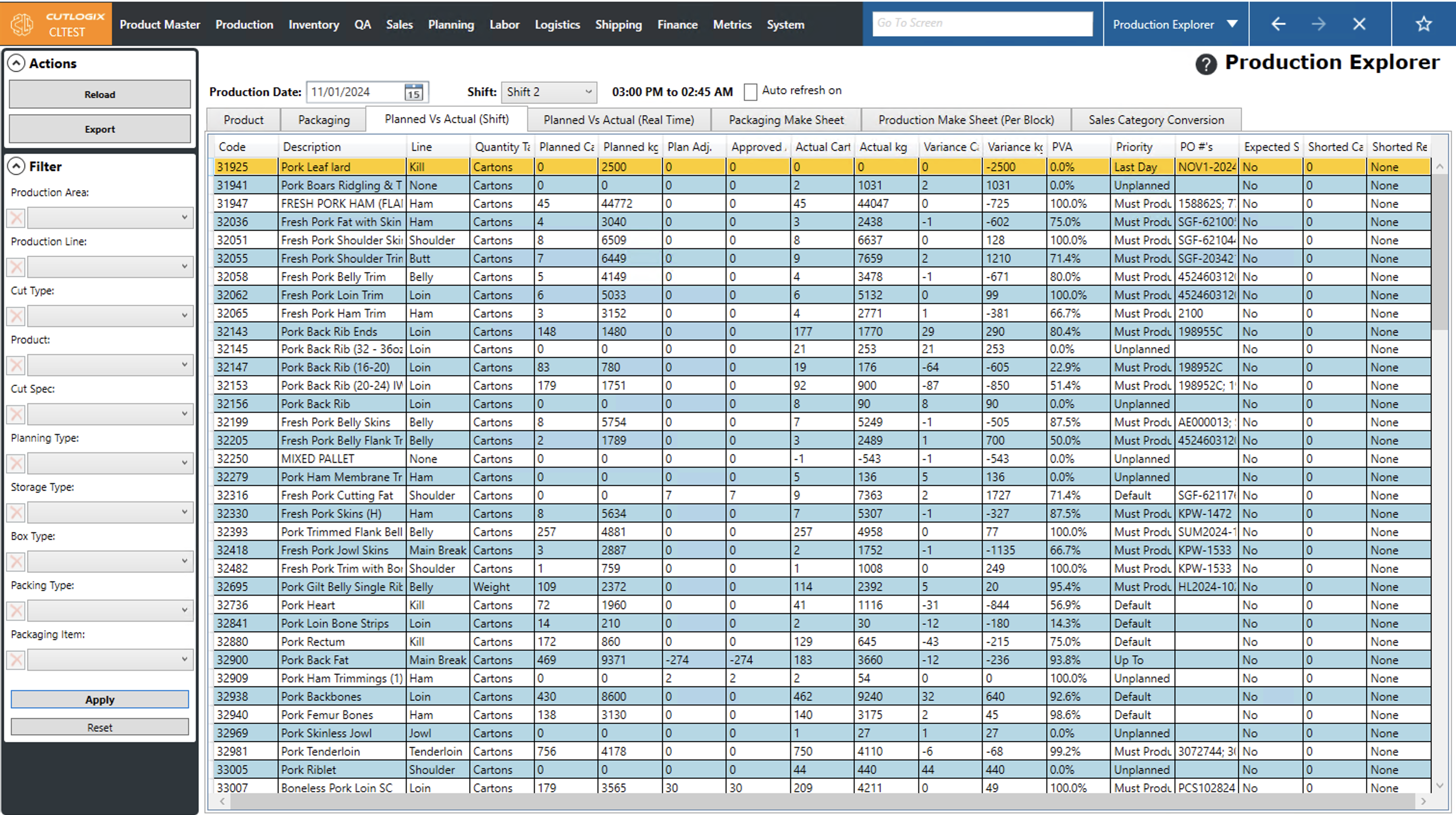 Step 1: First we'll view the planned vs actual by shift. Start by navigating to the "Production" tab → "Production Explorer", then open the "Planned Vs Actual (Shift)" tab.