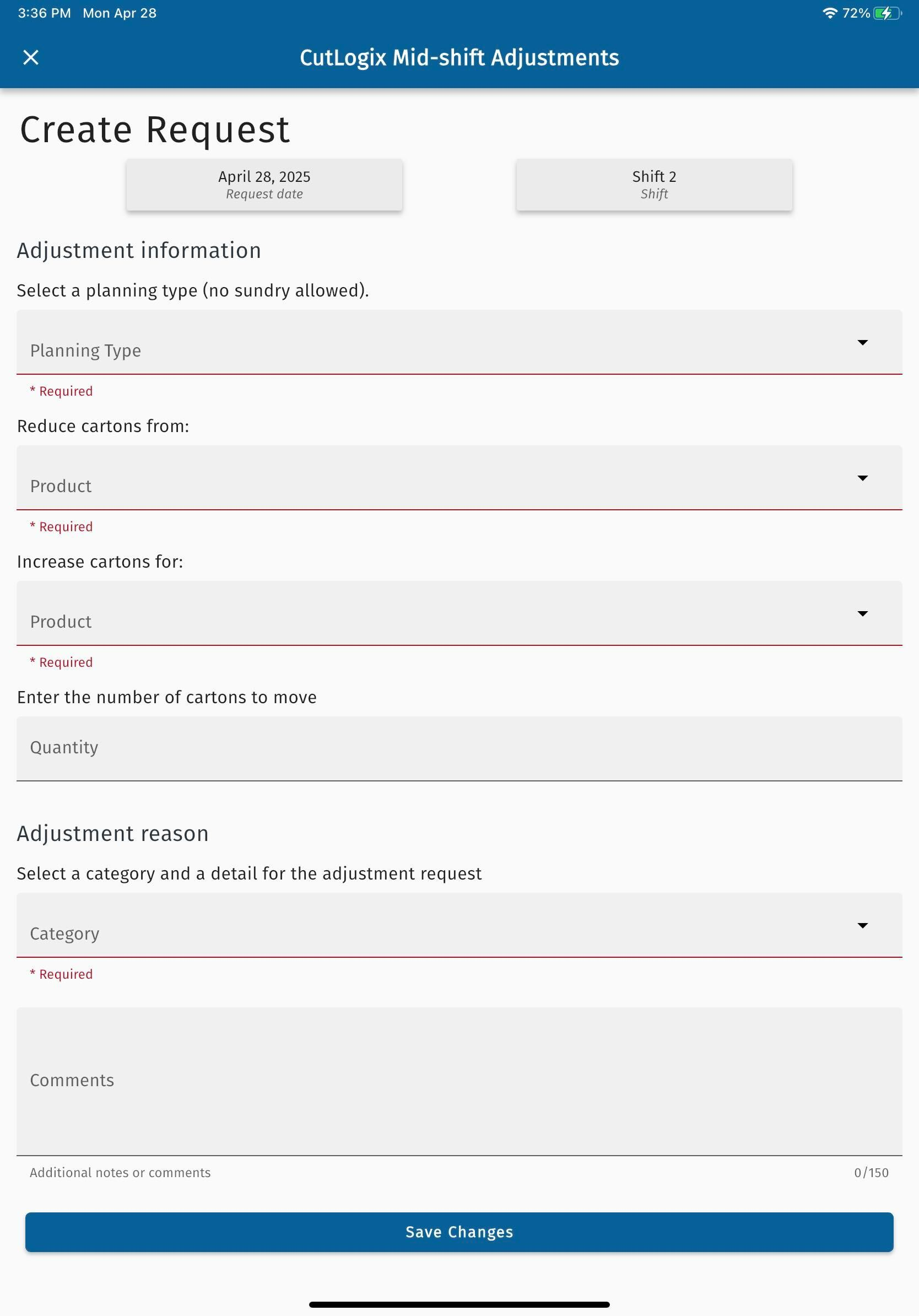 • Category: The reason the mid-shift adjustment is being requested, selected from a pre-populated list of categories.