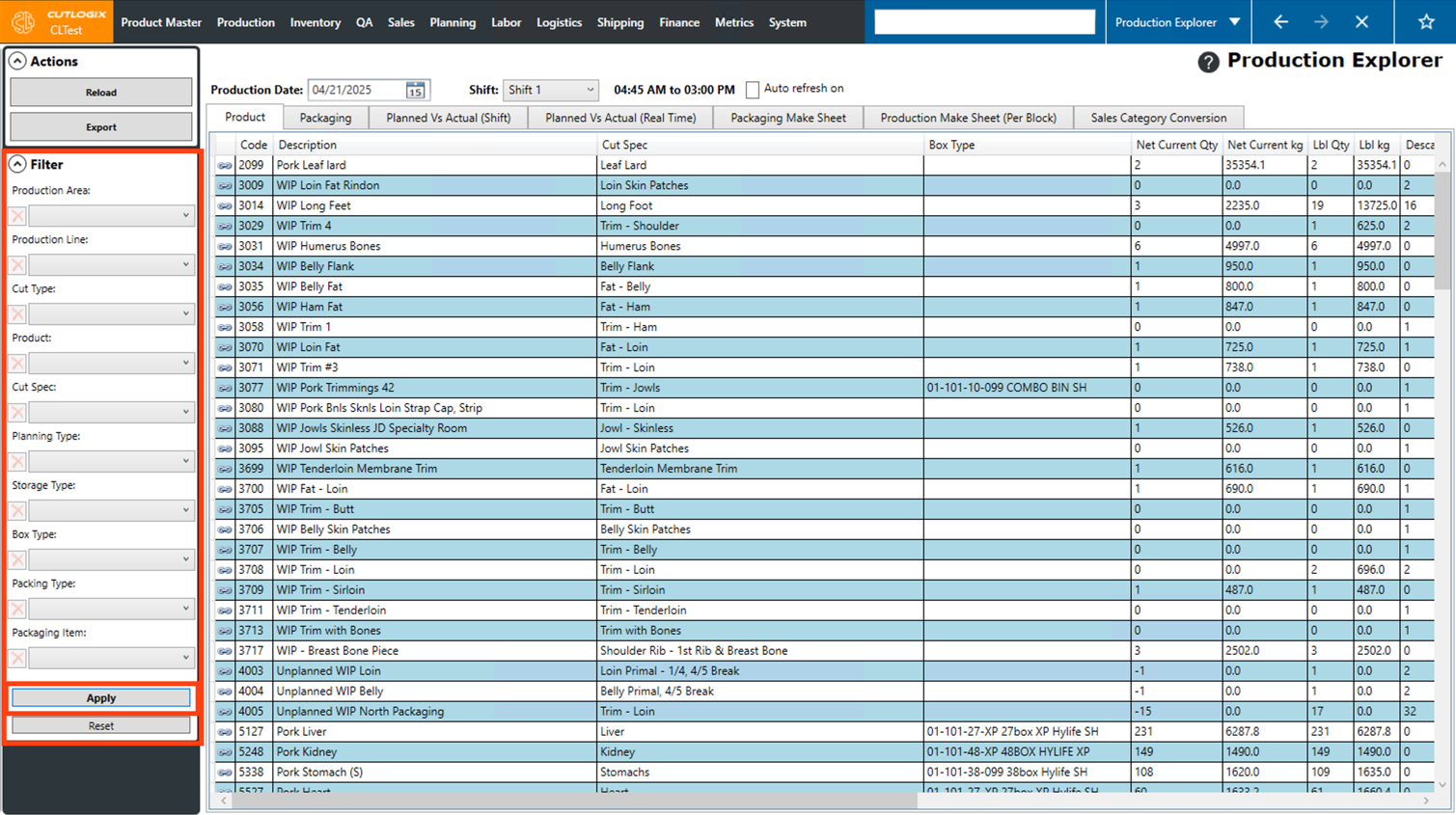 • Net Current Qty: The number of units of product that have currently been produced on the selected day (i.e. boxes, cases, pieces, etc.).