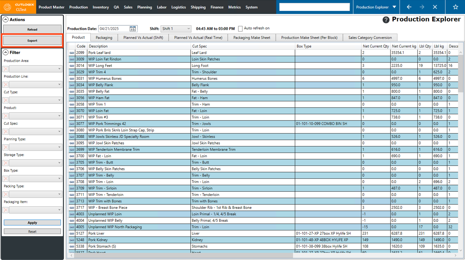 Step 1: Navigate to the "Production" tab → "Production Explorer", then click on the tab that you want to export data for.
