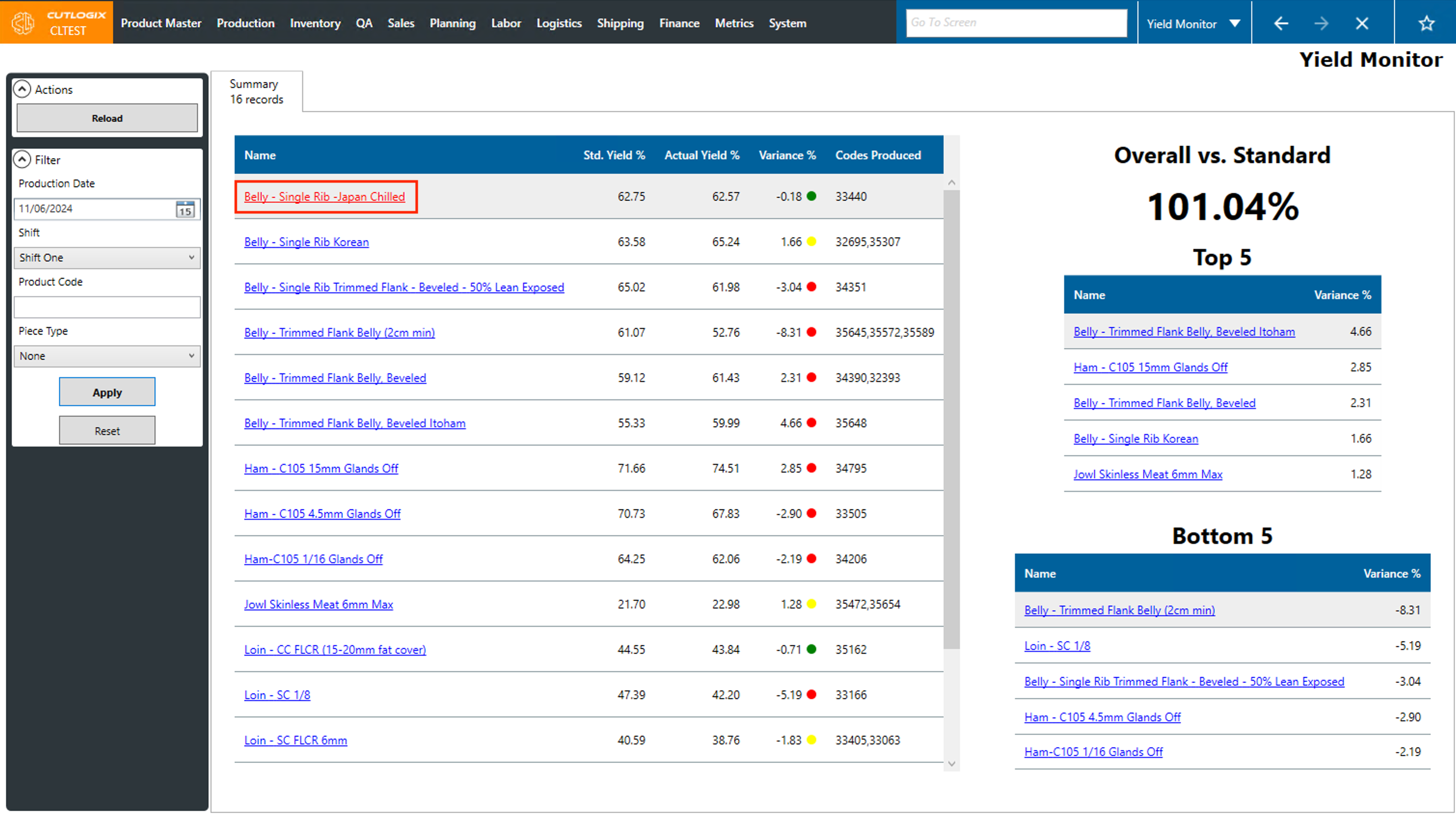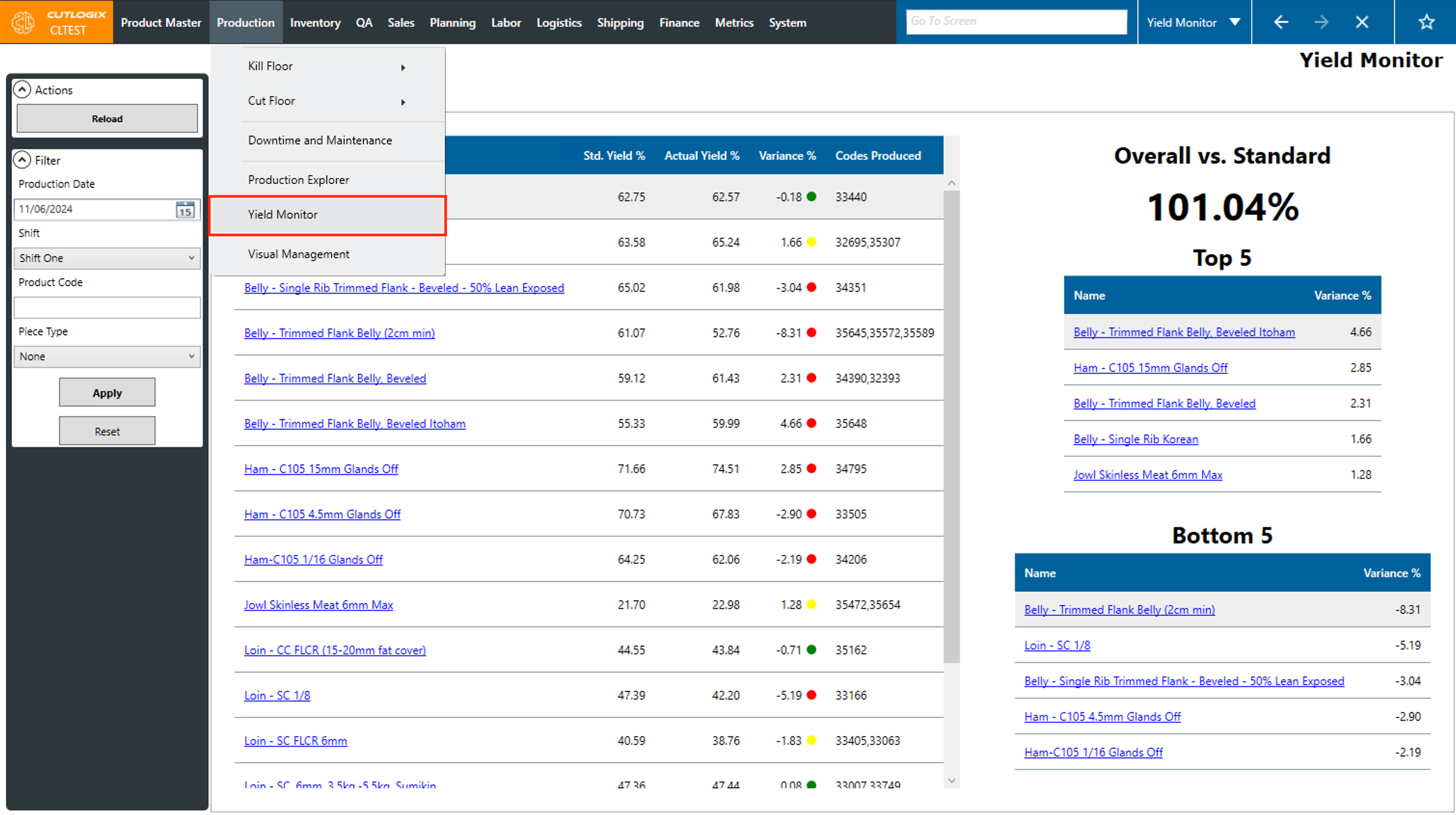 DemoStep 1: Navigate to the "Yield Monitor" page (Under the Production menu → Yield Monitor)