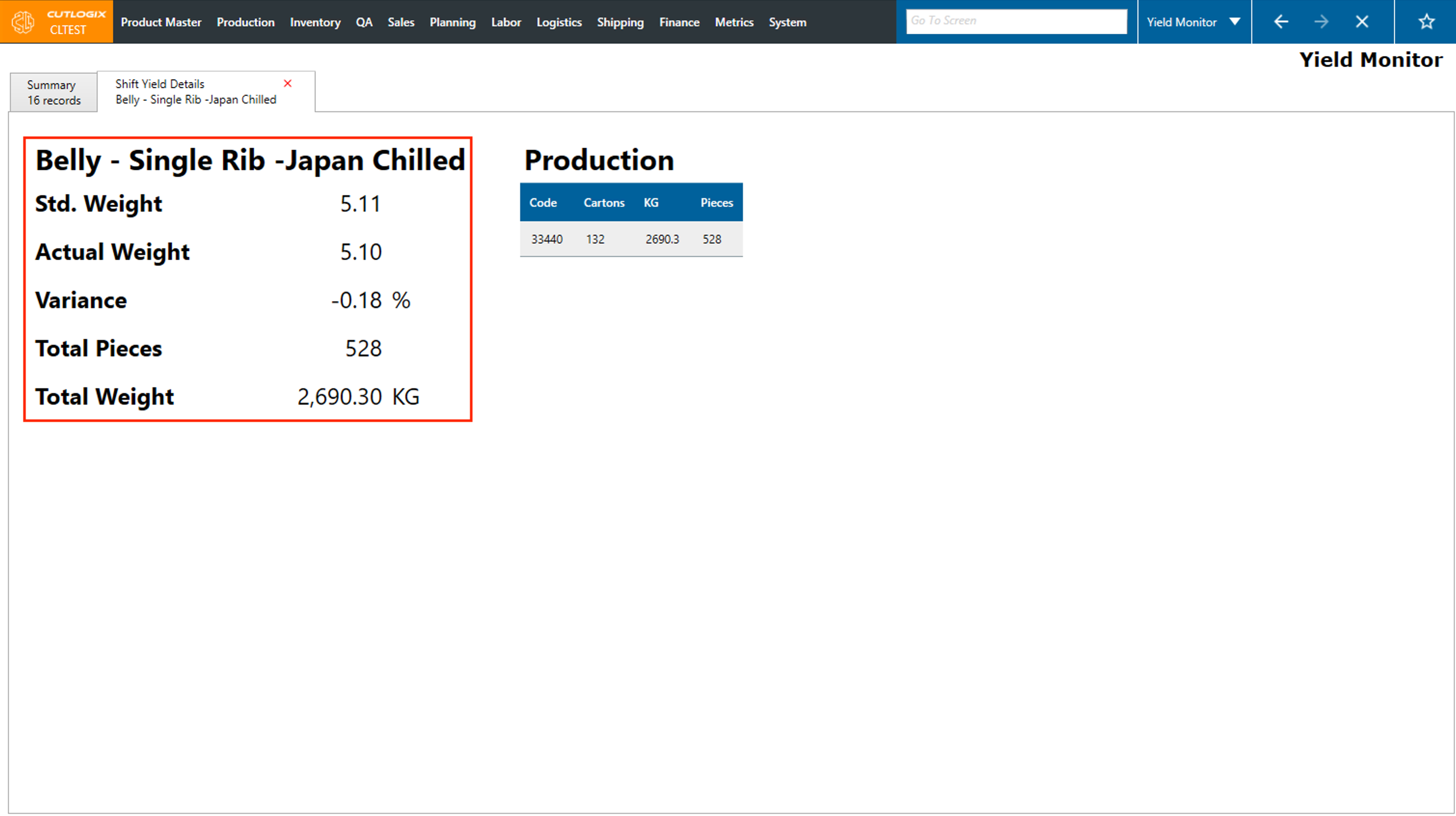Step 4: A details tab will appear and show you more information about that cut spec for the selected shift. Here you can see information such as the standard weight of the cut spec, the average actual weight for the cut spec on that shift, the variance percentage, total pieces produced on that shift and the total weight.