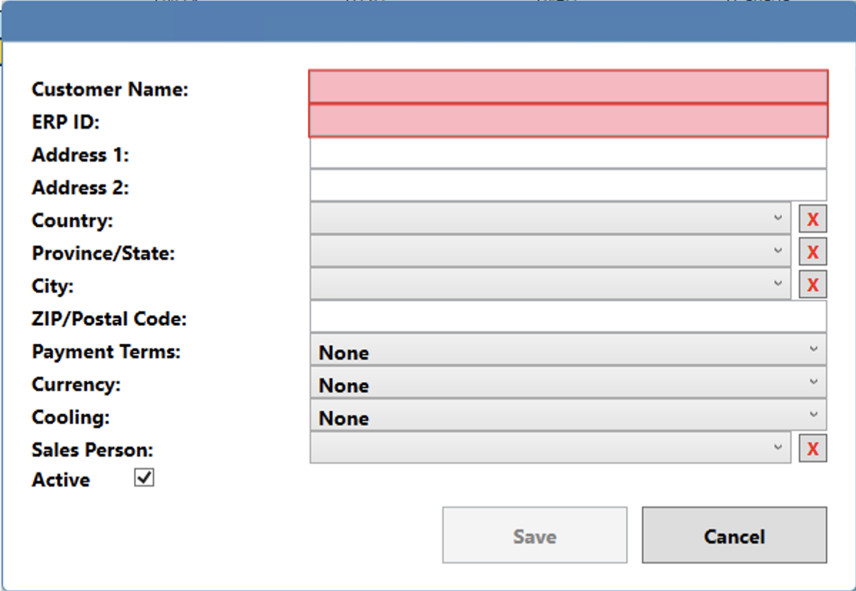 Step 3: A dialog will appear on the page where you can enter information about the customer to be added. Fields highlighted in red are required and must be entered in order to create the new customer. These required fields are "Customer Name" and "ERP ID" (Enterprise Resource Planning ID)