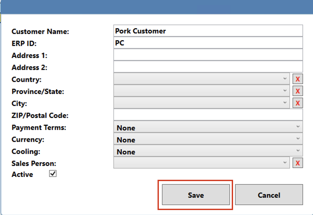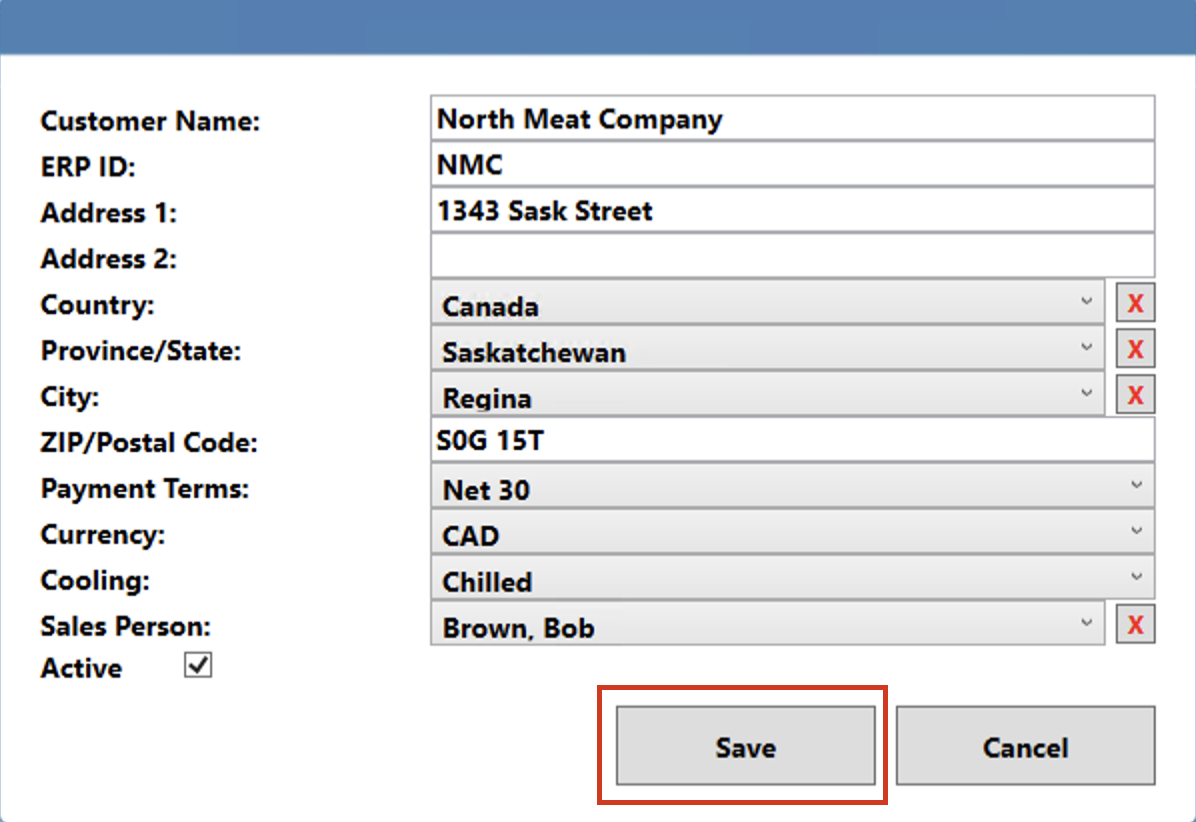 Step 4: Once you're ready to save the changes to the customer, click the "Save" button at the bottom of the dialog. Note: If you make changes that you don't want to save, clicking the "Cancel" button will discard these changes and close the dialog, leaving the customer unmodified.