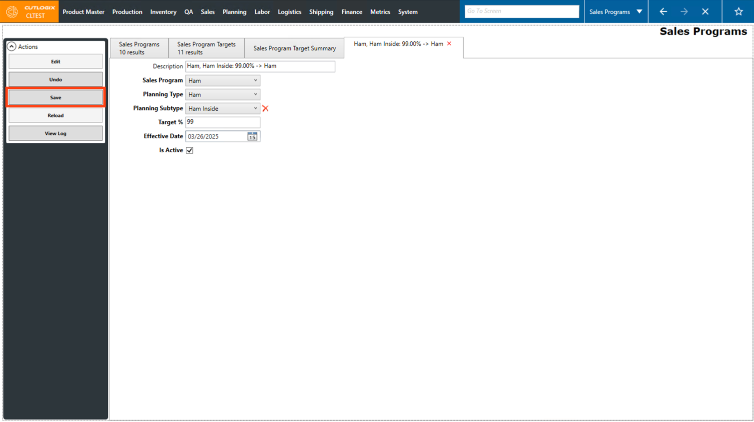 Step 5: Once all the required fields have been entered, click the "Save" button in the Actions Panel to save the new sales program target.