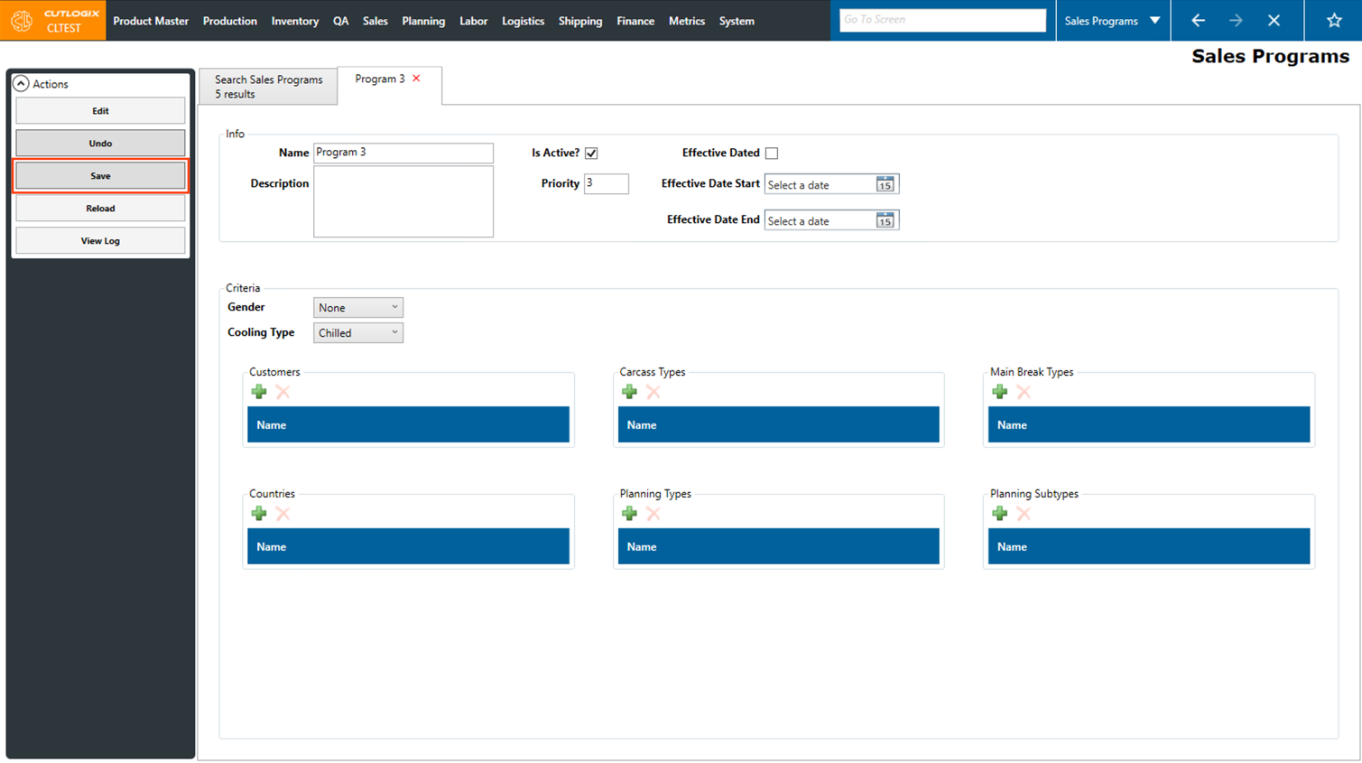 Step 4: Once the "Save" button is enabled, click on it to save the new sales program. If a user no longer wishes to save the sales program then they can hit the undo button in the actions sidepod.