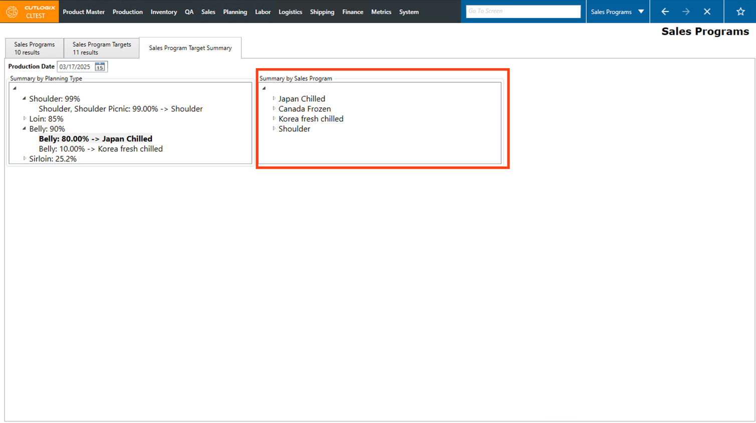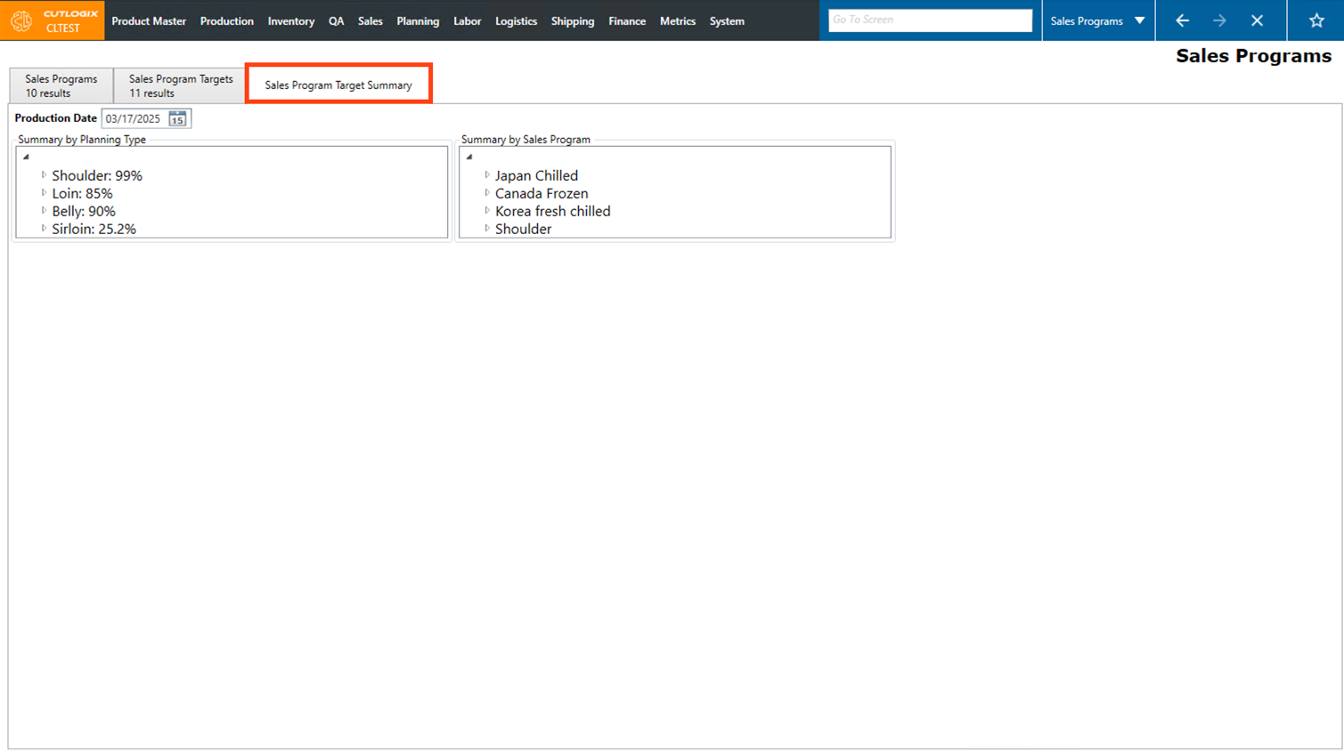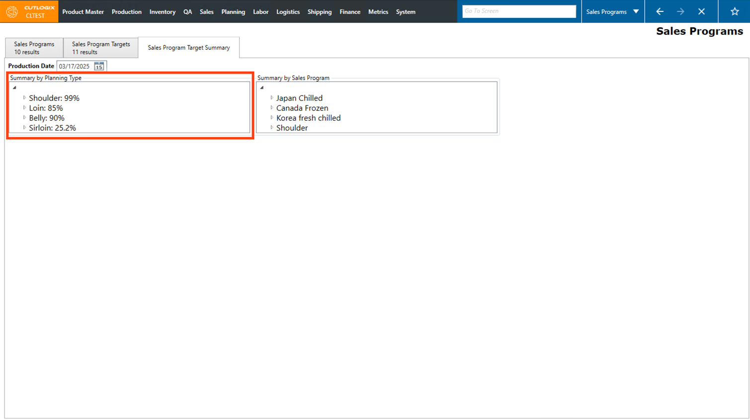 Step 4: The "Summary by Planning Type" initially displays a list of main planning types (excluding Sundry and Offal). Next to each planning type, a percentage will appear that represents the total amount of that planning type that is allocated to sales program targets.