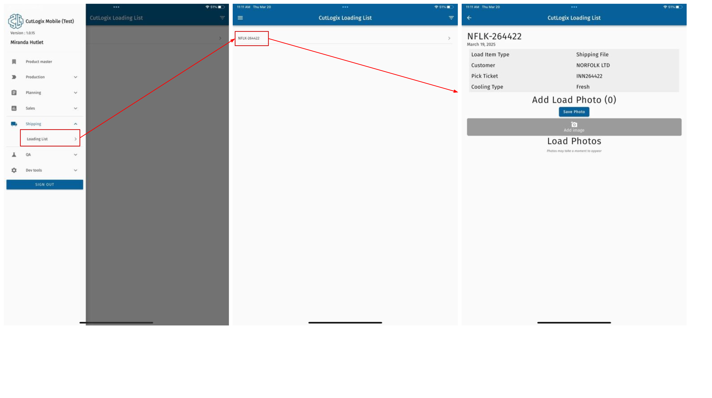 Step 4: These photos are added to the load from the CutLogix mobile app. This can be found under the "Shipping" → Loading List menu, then clicking on the load from the list. Then the option to upload load photos will appear.