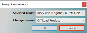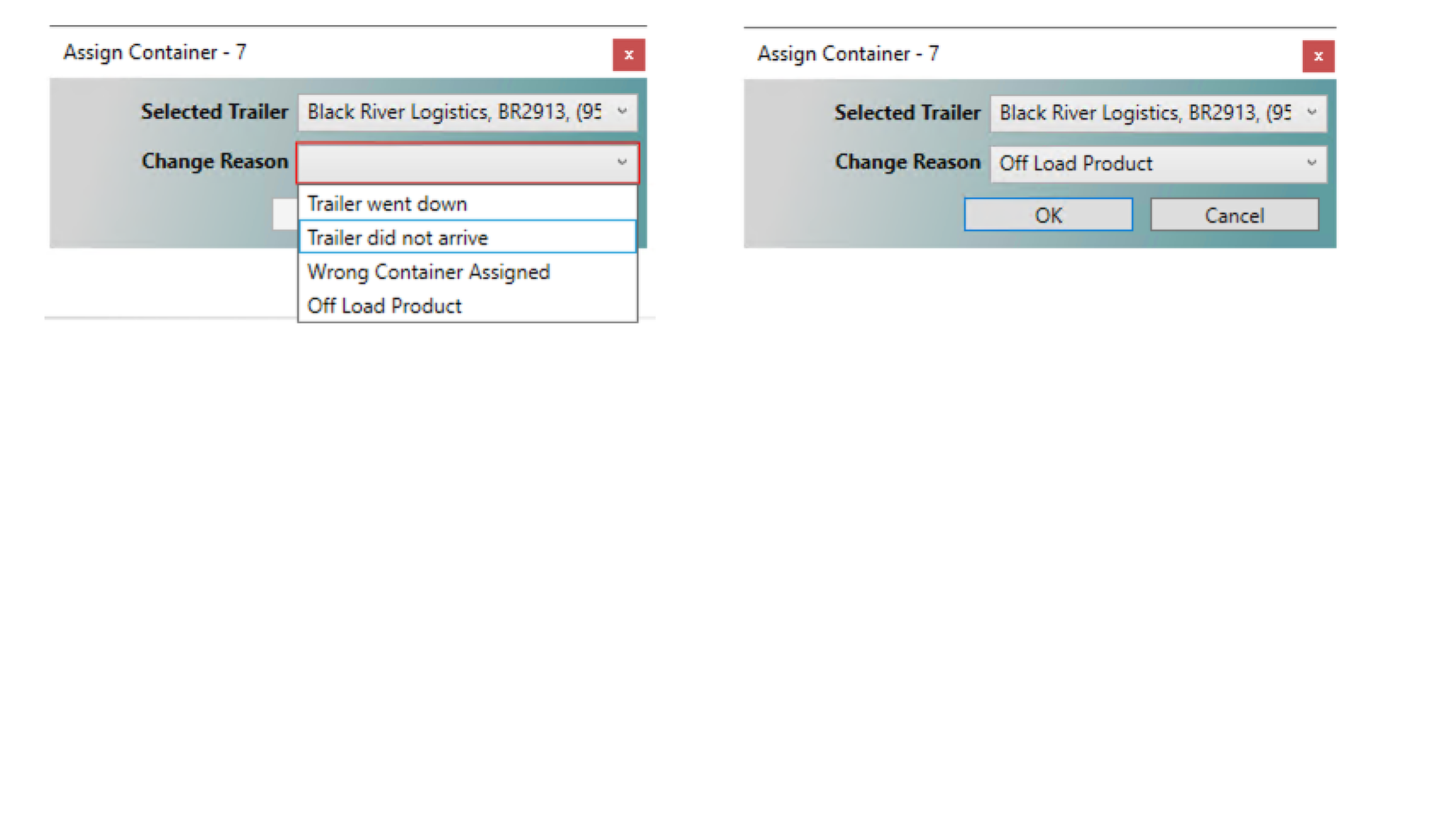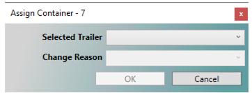 Step 3: Clicking the Assign Container action will bring up a dialogue box with two dropdown menus. From the Selected Trailer menu, users can choose a trailer to assign the selected order to. If this is the first time a trailer has been selected, then making a choice from the Change Reason drop is not necessary. On all subsequent trailer selections for this order, users are required to select one of the available reasons to enable the ‘OK’ button.